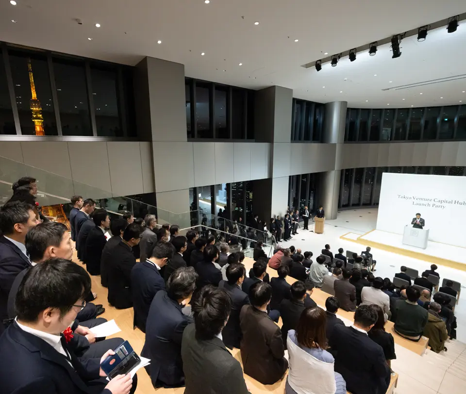 2025年11月、港区・麻布台ヒルズに国内最大級のVC拠点「Tokyo Venture Capital Hub」が開設され、その門出を祝う開会式典が盛大に開催されました。第1部のセレモニーは大階段エリアにて執り行われ、拠点の理念であるリスクマネー供給の強化、スタートアップ支援に向けたコミュニティ形成、国内外拠点との連携方針などが紹介されました。続く第2部は34階SkyRoomにて立食パーティーが催され、約170名の関係者が参加し、東京の夜景を背景に活発な交流が行われました。